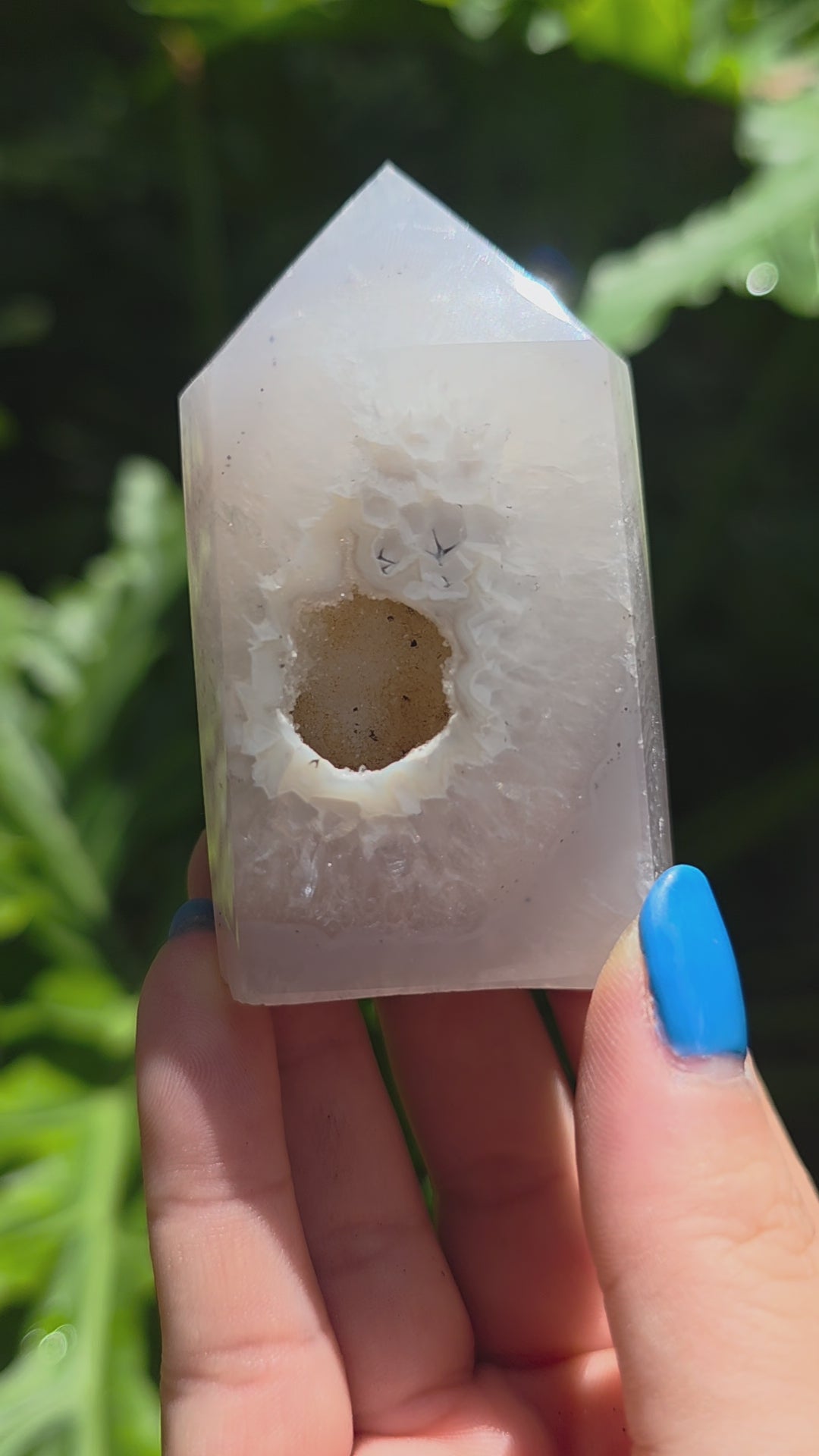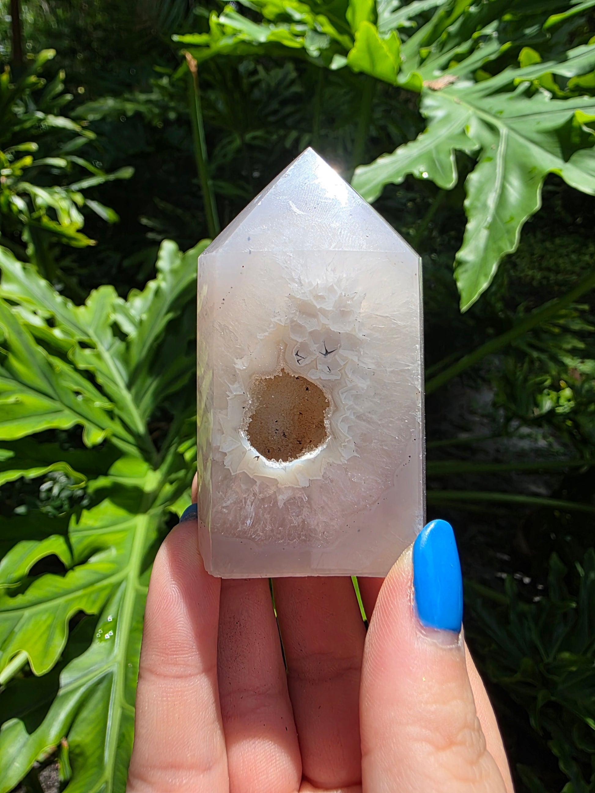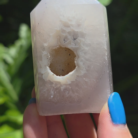 Raw and radiant, this mini agate tower draws you in with a powerful centerβa bold, cavern-like druzy pocket surrounded by crystalline petals that burst outward in frosty perfection. The outer stone is polished to a silky finish, revealing subtle swirls of lilac-grey and creamy white that contrast beautifully with the earthy golden center.