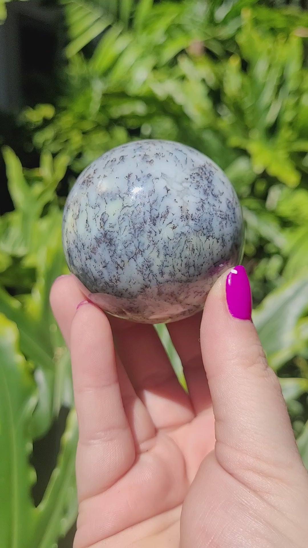 Tap into the grounding wisdom of the Earth with this mesmerizing Dendritic Opal Sphere. Known for its dreamy white and cream base with delicate tree-like inclusions (called dendrites), this stone resembles miniature landscapes or ancient forest scenes captured in crystal form. Each piece is a unique, natural work of art.