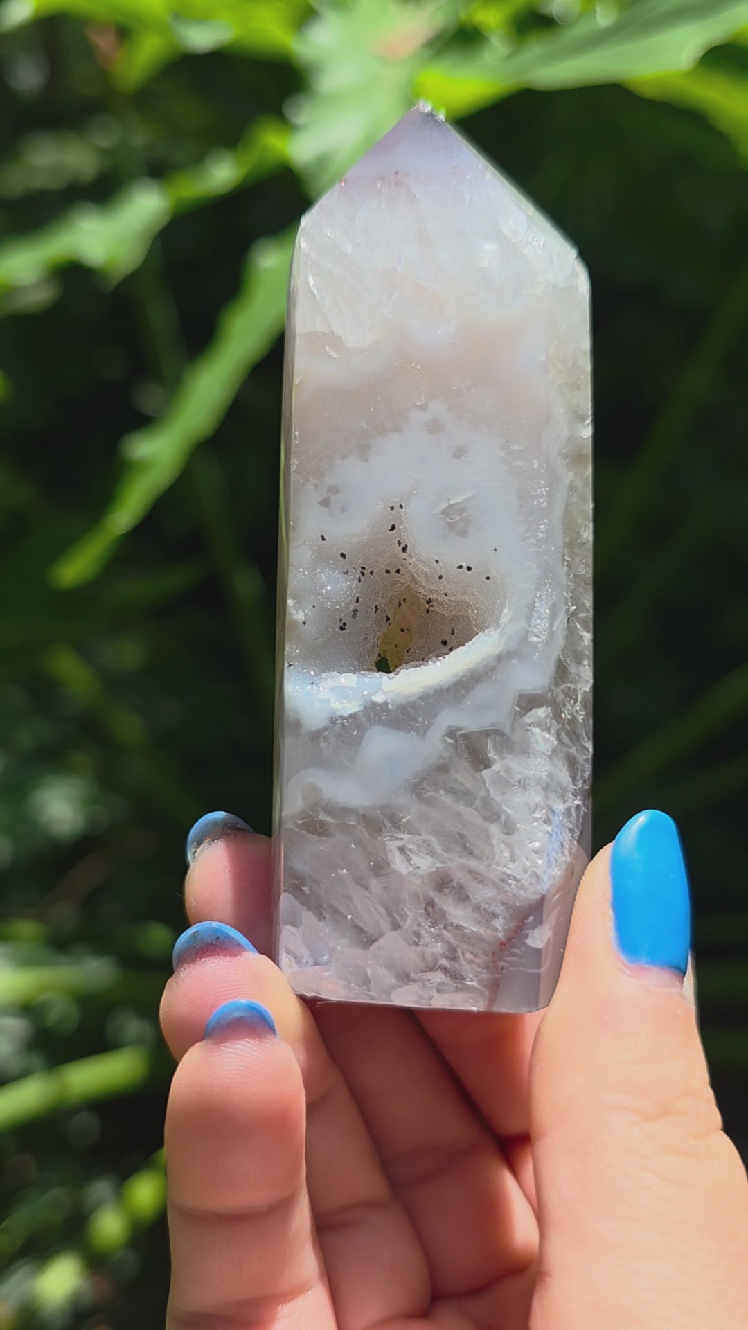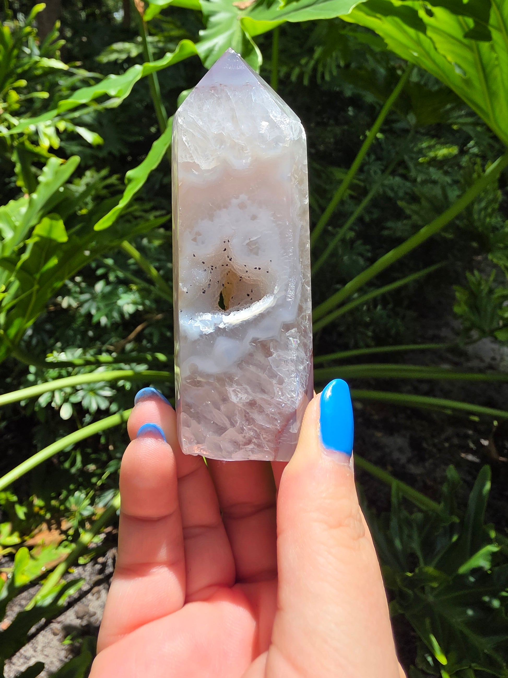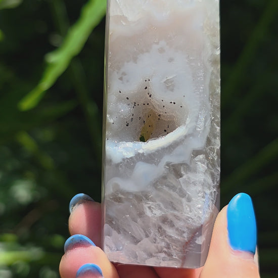 Like the last rays of light drifting across a dreamy sky, this druzy agate tower is a blend of mystery and brilliance. On one side, a dramatic crystalline cave opens into the heart of the stone—glimmering with quartz sparkle and framed by soft, cloudy bands. Turn it over, and you’ll discover floating freckles of iron-rich inclusions and a second pocket, giving this piece energy and texture from every angle.