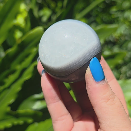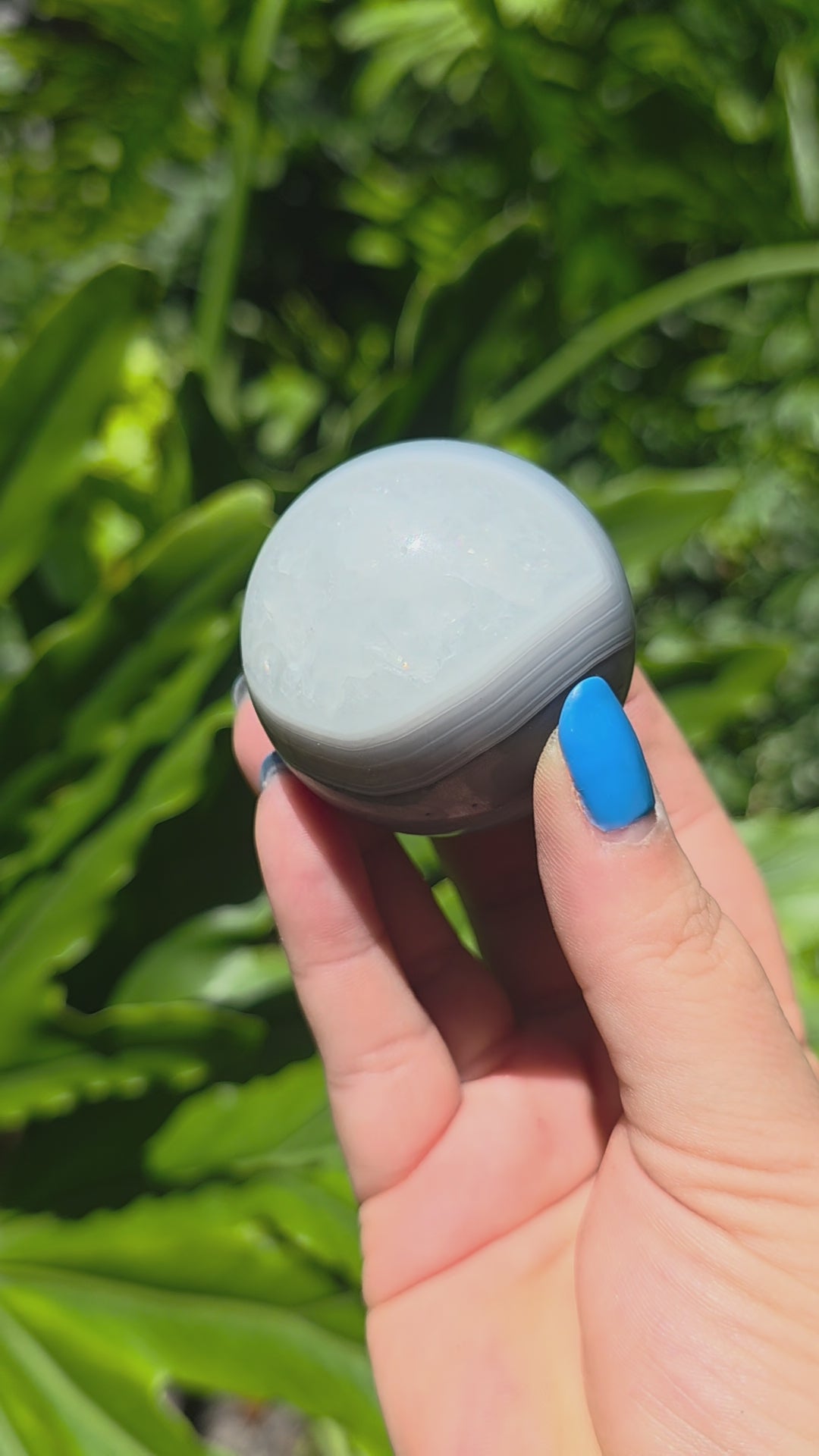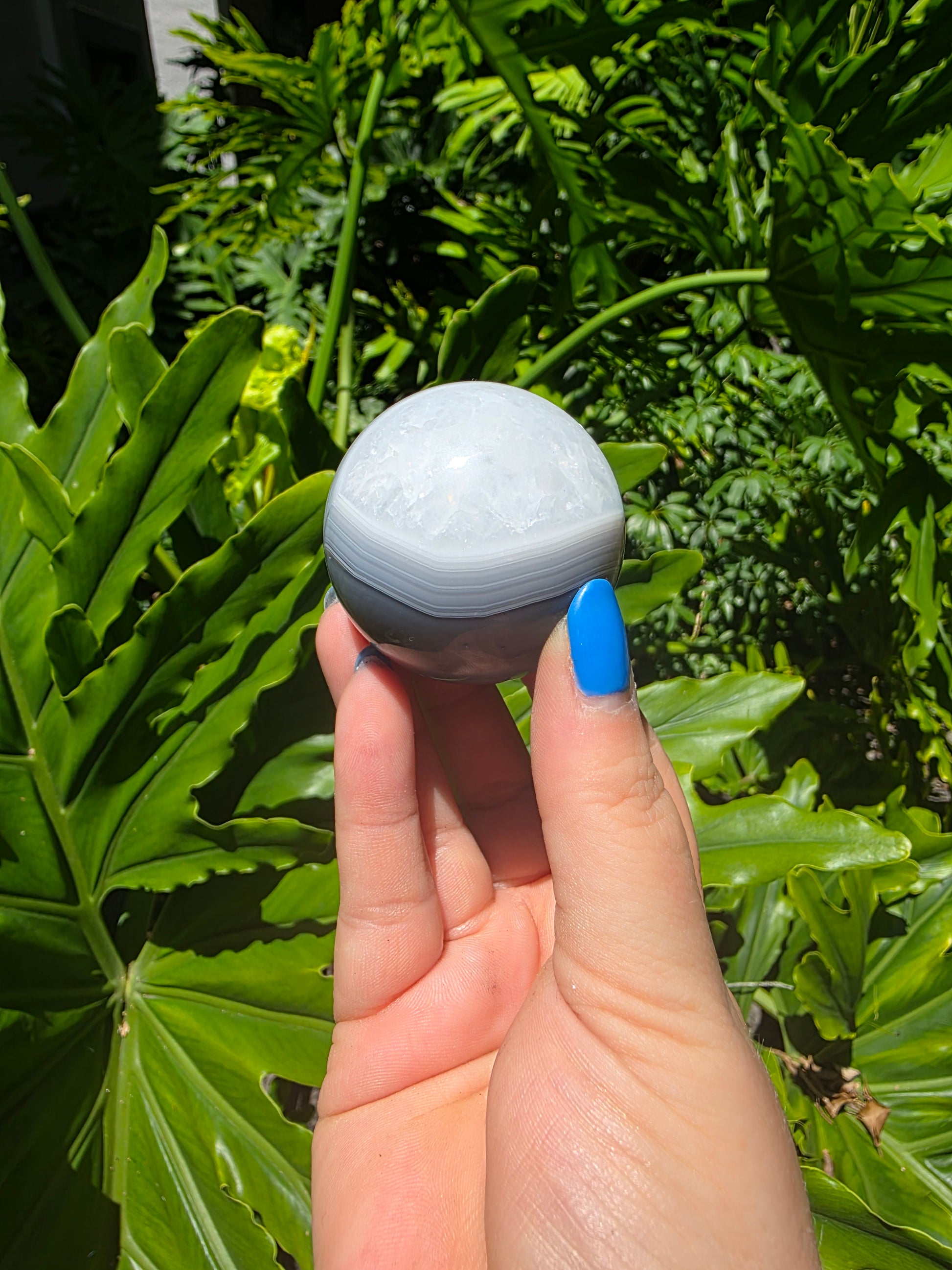 This ethereal Banded Agate sphere is a study in celestial stillness—icy, luminous, and ever so captivating. Nestled at its heart lies a delicate core of shimmering quartz, surrounded by soft milky agate that ripples in dreamy, symmetrical layers. It’s the kind of piece that quietly commands attention, perfect for those who love a mix of precision and raw natural magic.
