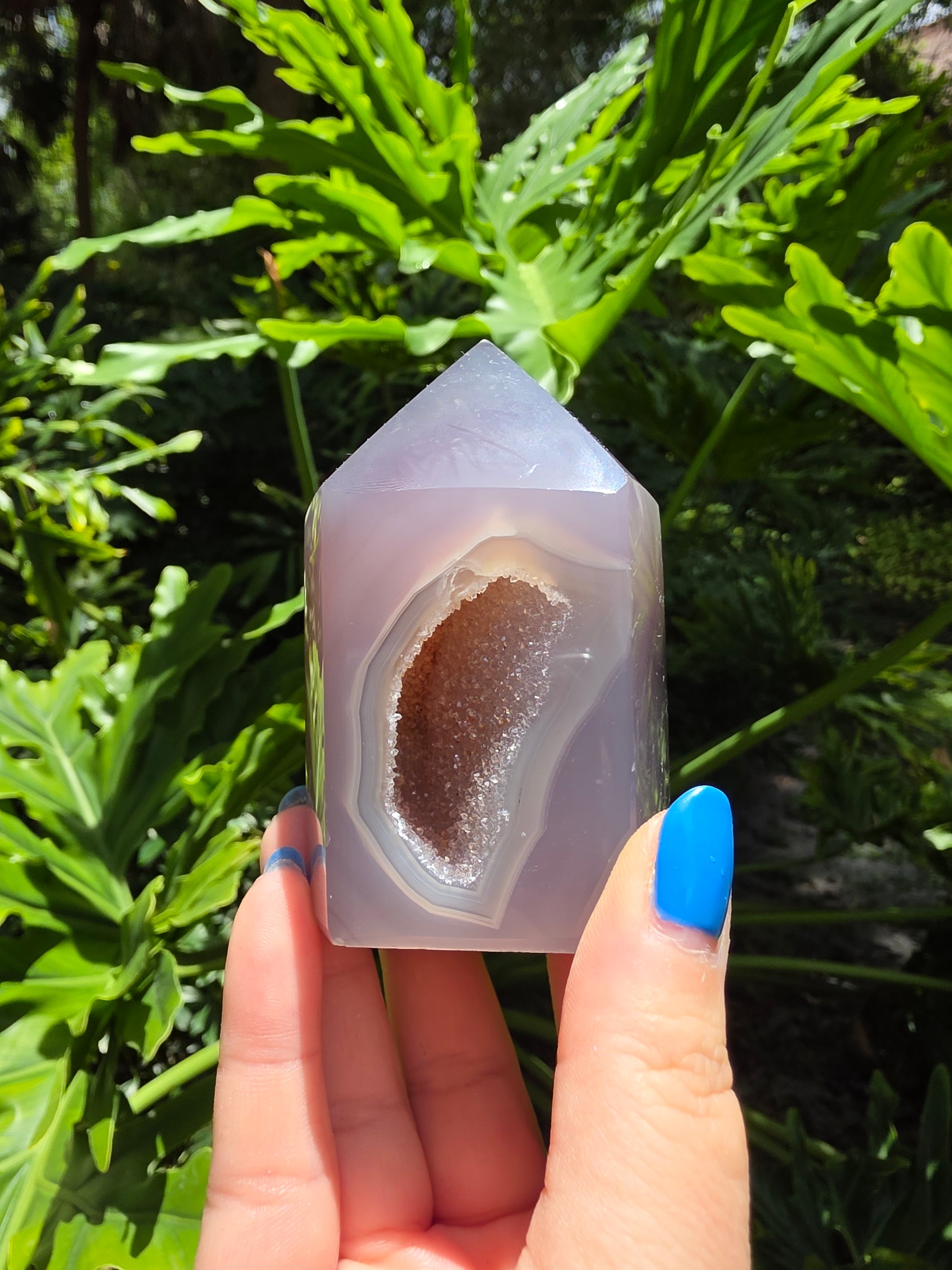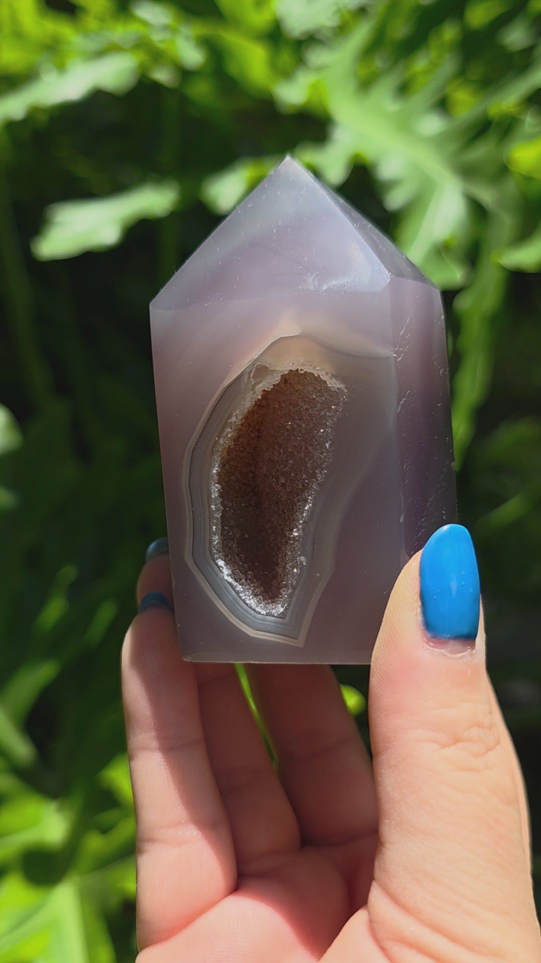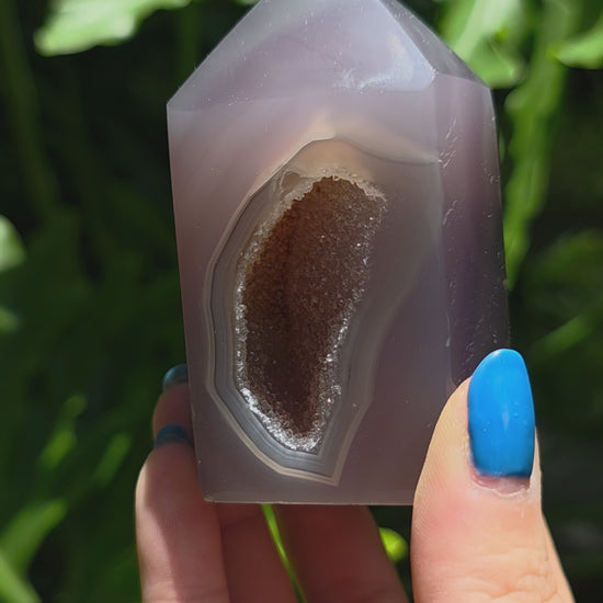 With a velvety lavender base and a dramatic druzy chamber, this agate tower is pure enchantment. The central pocket sparkles with fine crystals in earthy champagne tones, framed by symmetrical banding that ripples like a protective aura. The polish is smooth and lustrous, amplifying the gentle curves and contrasting textures throughout.