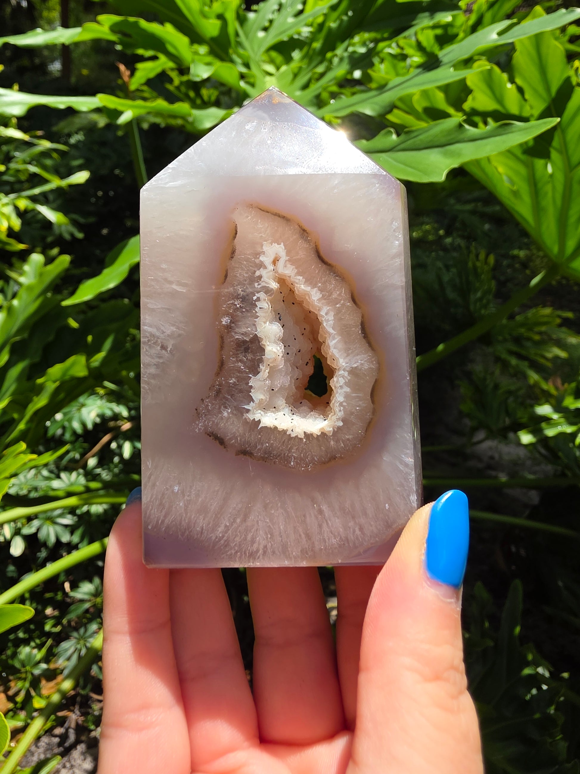 Natural Brazilian agate tower with large open druzy center