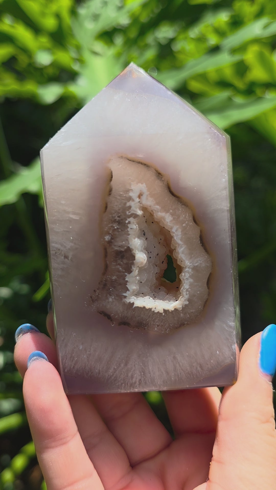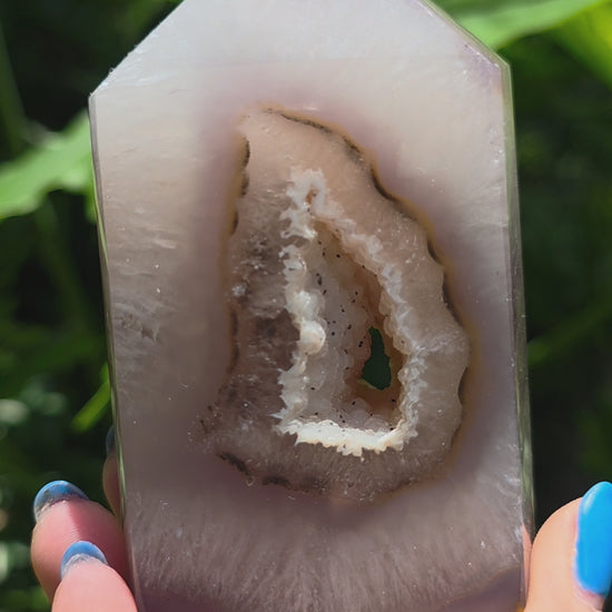 With a crystalline center shaped like a hidden bloom, this agate tower radiates soft elegance and grounded energy. At its heart is a stunning druzy-lined cave, ringed in petal-like layers of creamy quartz, dusty rose, and lavender-gray. The outer polish is glassy smooth, highlighting the inner structure like a window into Earth’s artistry.