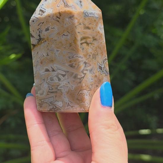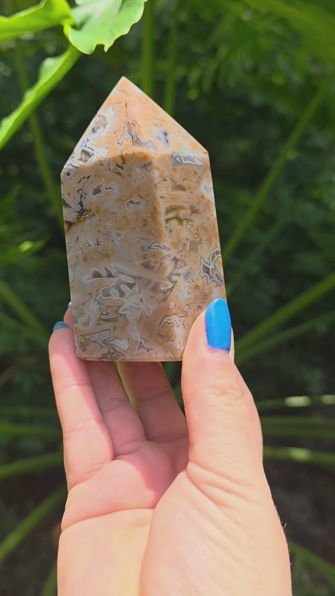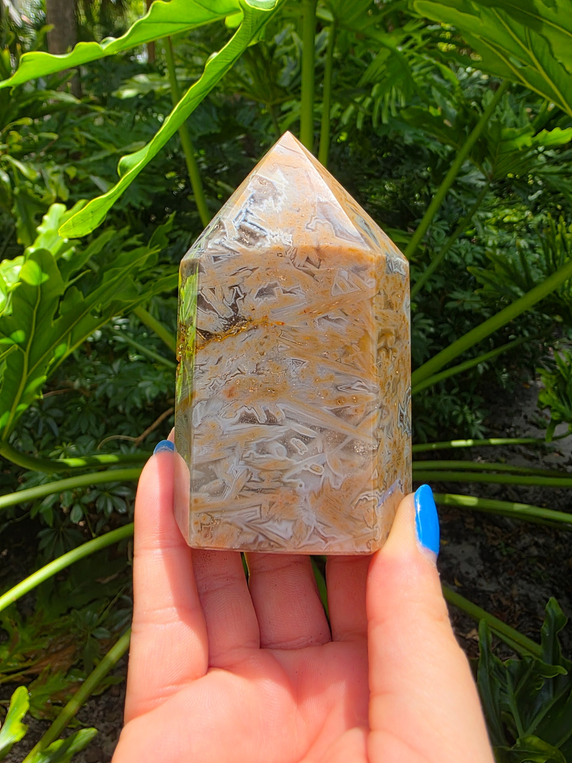 Like sunlight filtering through a wild thicket, this breathtaking Sagenite Agate tower features intricate sprays of golden rutile inclusions dancing across a dreamy canvas of warm caramel, soft grey, and creamy quartz. Each needle-like formation tells a story of nature’s delicate chaos, frozen in time.