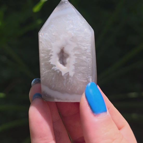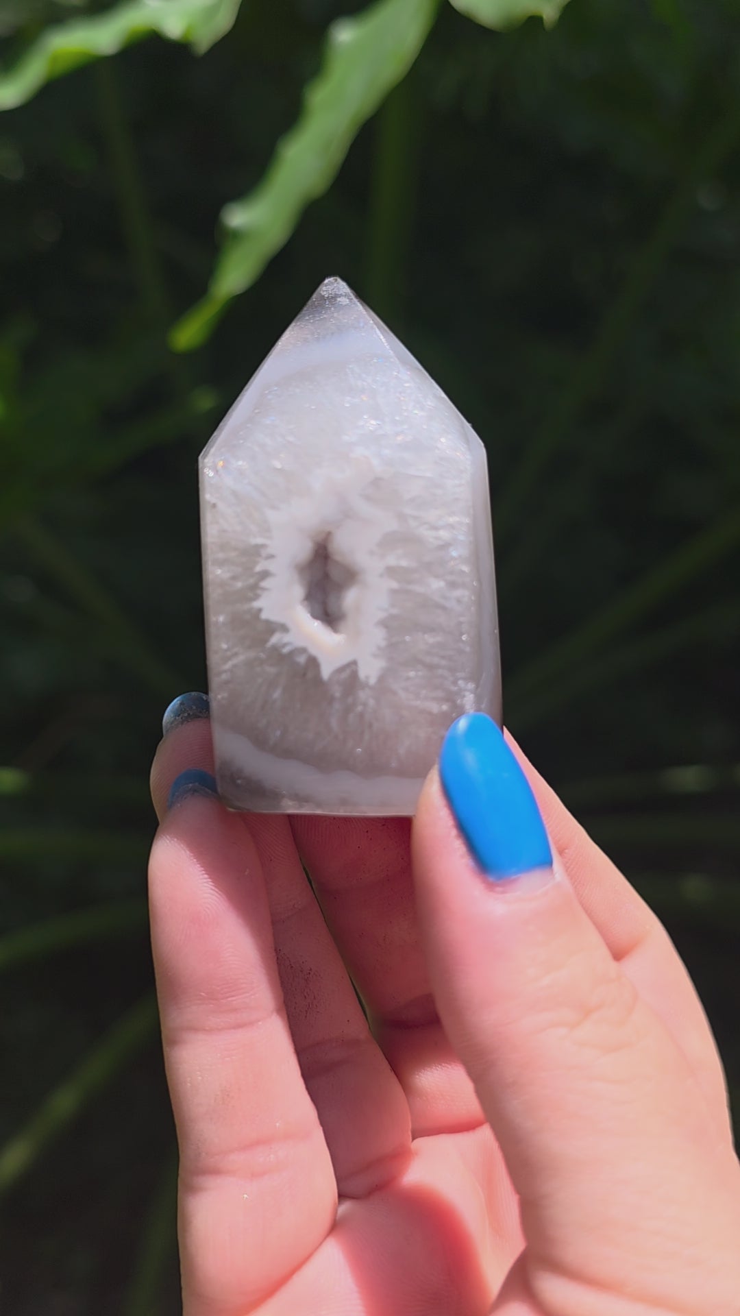 Petite in size but full of presence, this mini agate tower draws the eye inward with a striking natural druzy cave at its heart. The creamy bands ripple like soft waves around a delicate crystalline center, resembling a portal or seed bursting with moonlight.