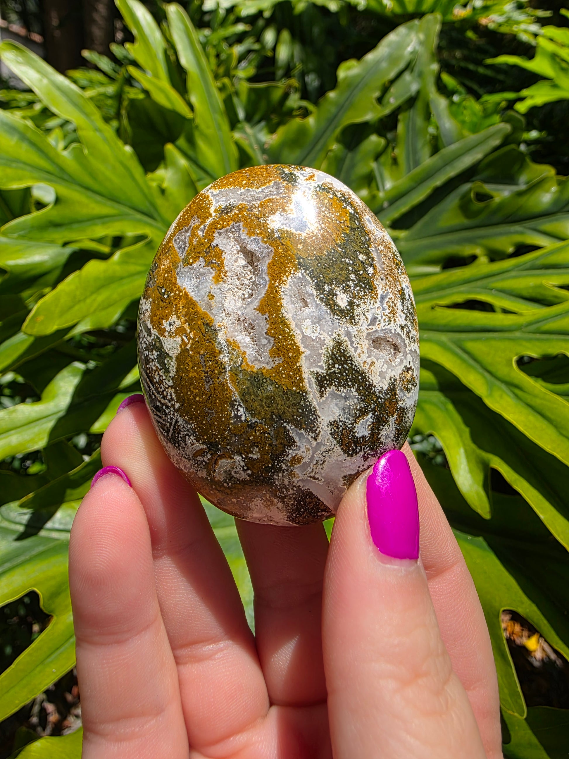 Bring serenity and joy into your daily life with our mesmerizing Ocean Jasper Palm Stones. Known as the “Stone of Joy,” Ocean Jasper is prized for its vibrant orbs, swirling patterns, and soothing colors that range from earthy greens and browns to dreamy blues, pinks, and creams. Each palm stone is one-of-a-kind, hand-polished to a smooth finish that feels amazing to hold.