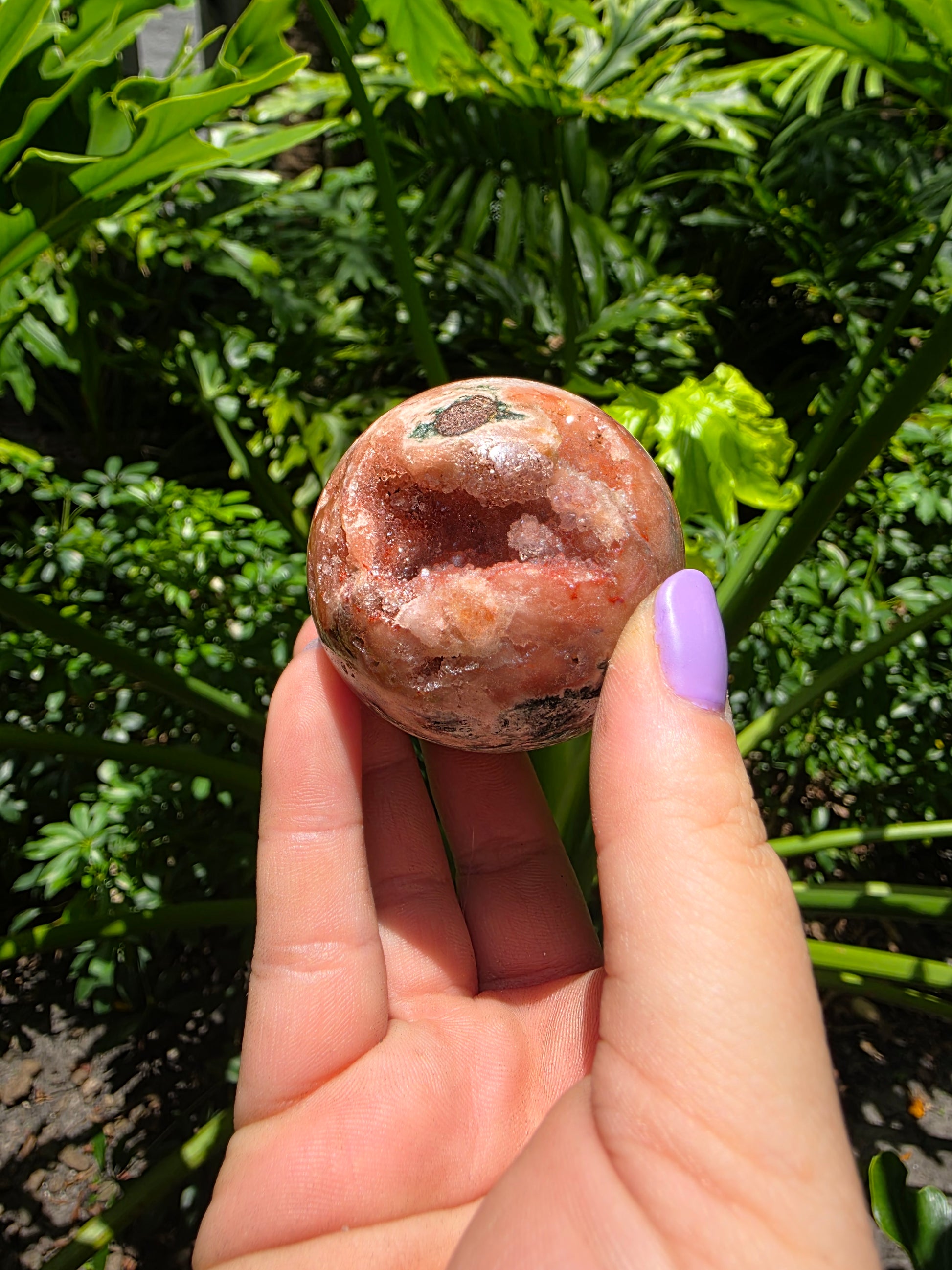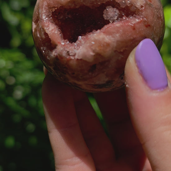 Ember Bloom is a Brazilian Pink Amethyst sphere with a deep, sparkling druzy pocket—a collector’s crystal that glows like a living ember encased in stone. This one-of-a-kind sphere radiates warmth, grounding, and gentle heart energy. Its palette of red-rose tones, fiery rust, and hints of mossy green captures the feeling of a desert sunset sealed inside quartz.