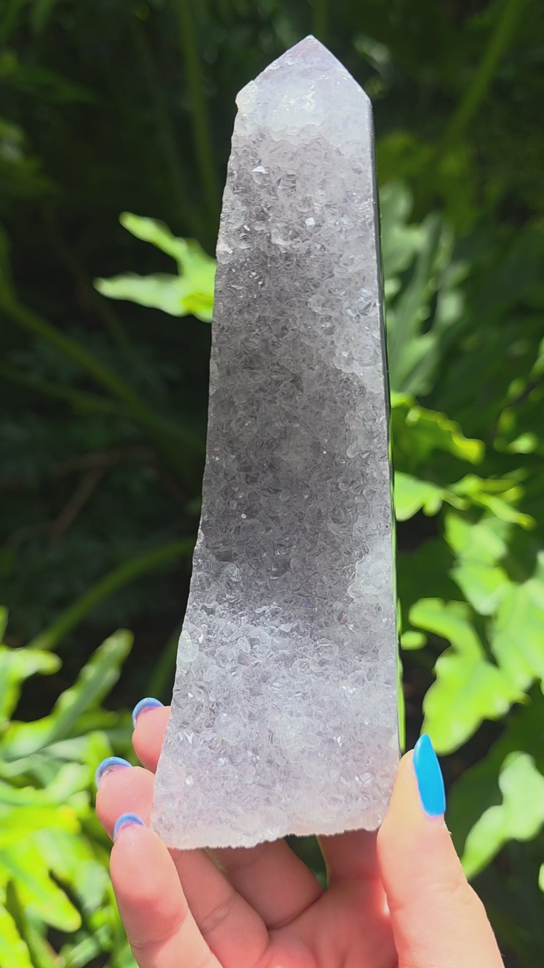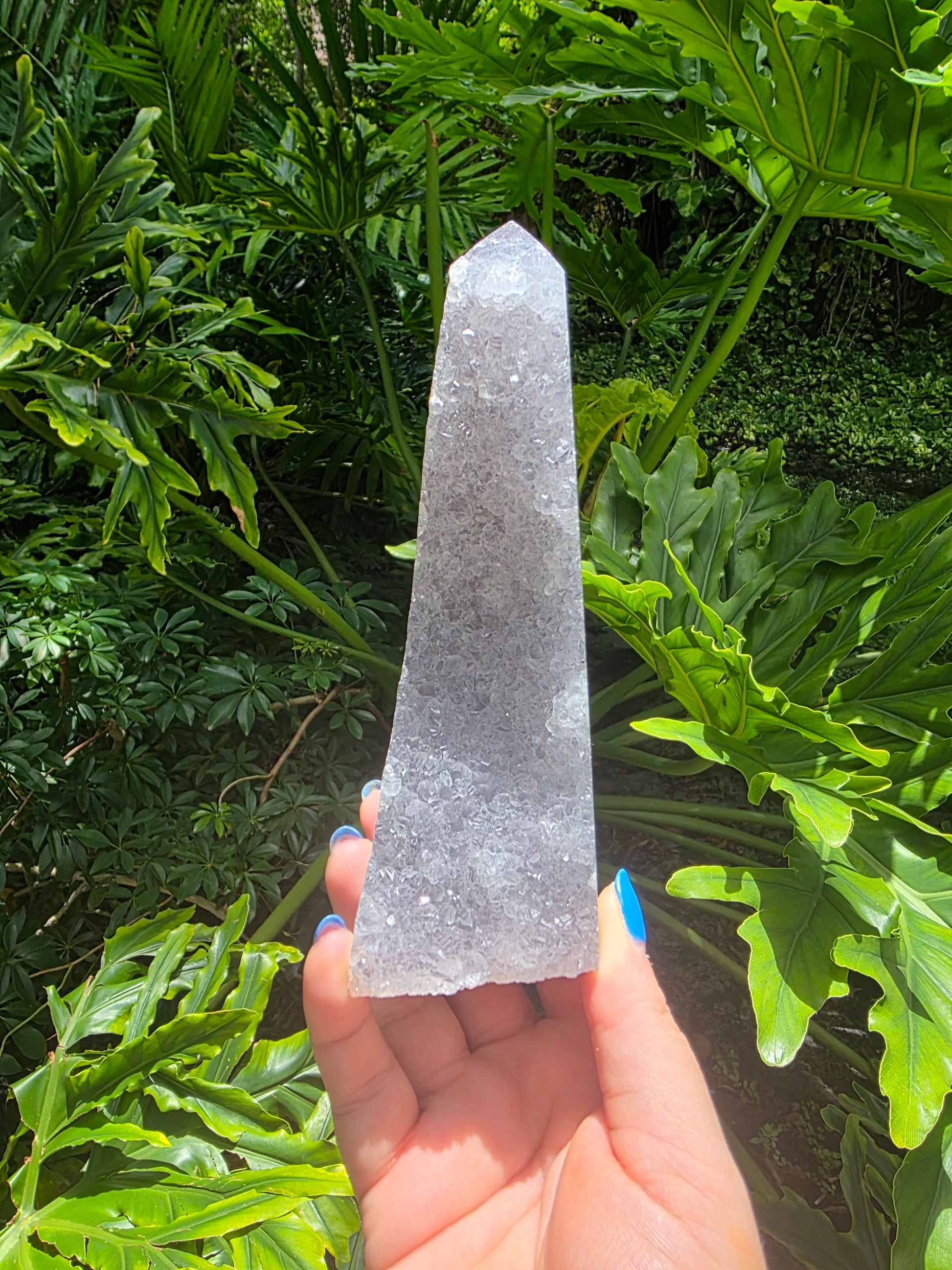 Its bold height, balanced shape, and striking contrast between texture and clarity make this a collector’s piece meant to anchor a space or serve as the focal point of any altar or shelf.