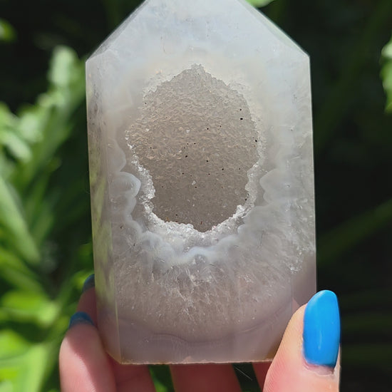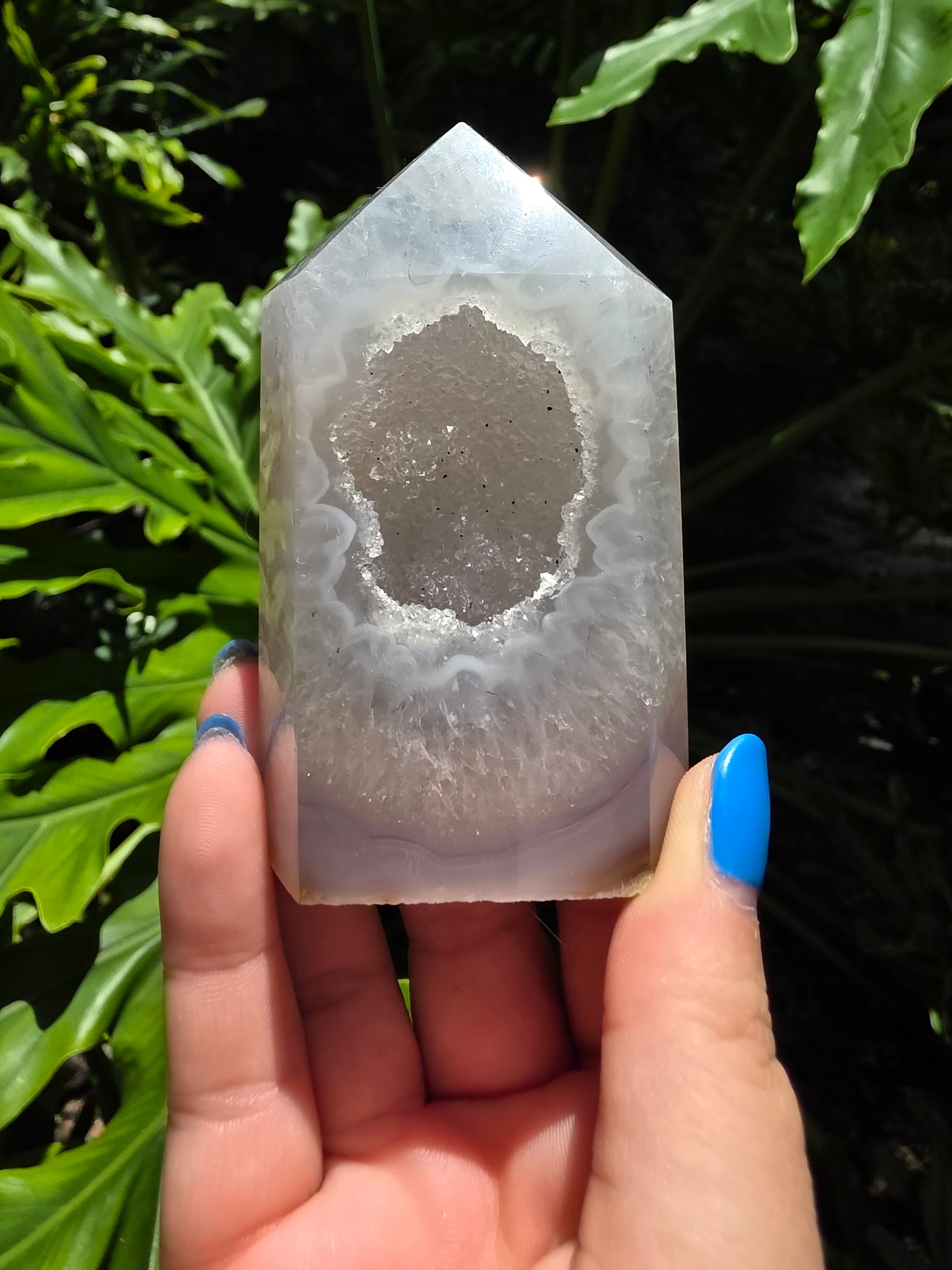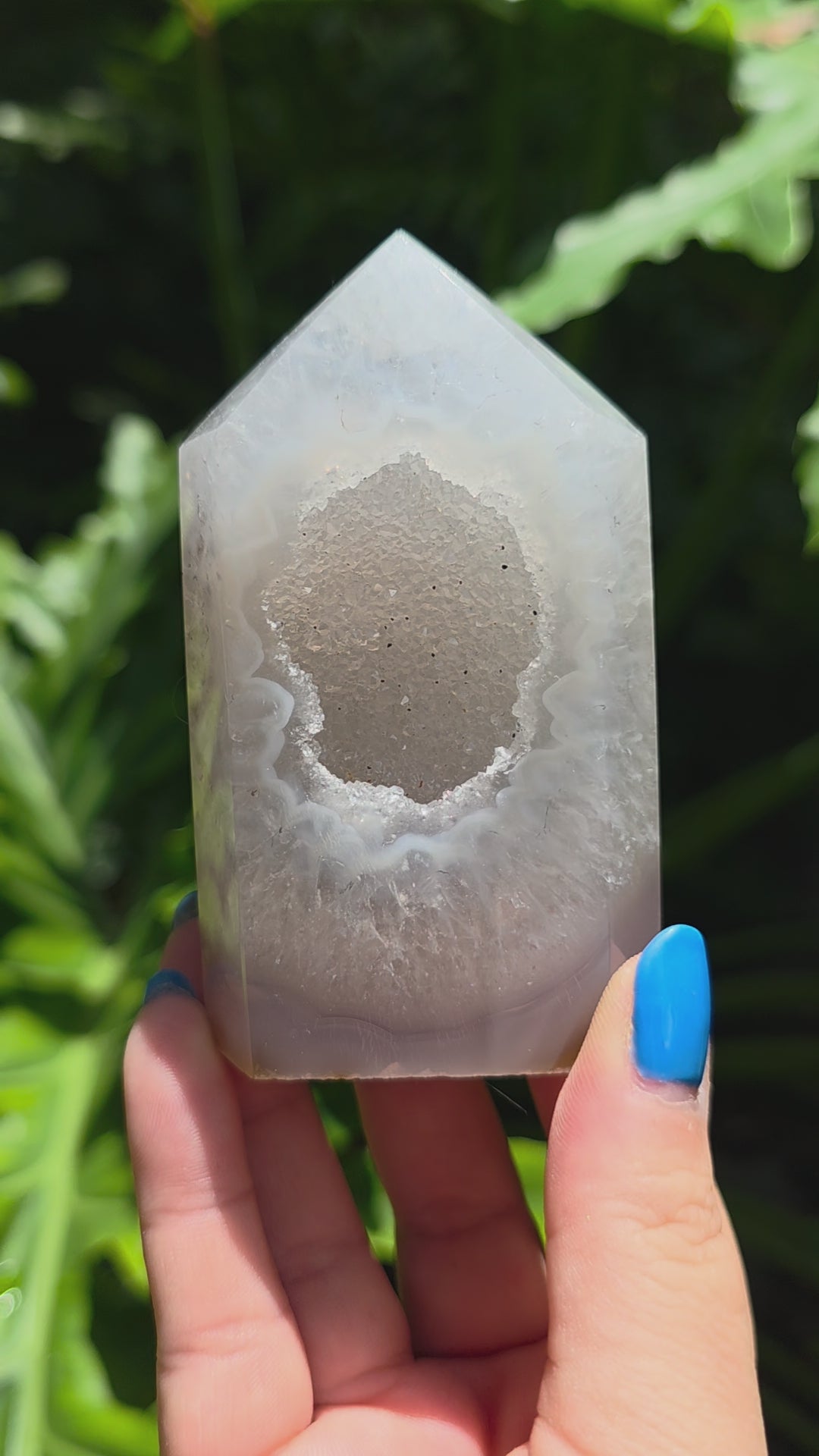 With a commanding presence and ethereal glow, this agate tower draws you deep into its sparkling heart. A wide druzy cave shimmers at the center, framed by layers of dreamy banding in soft grays, lavender smoke, frosted quartz, and whispery cream. The outer bands ripple like waves frozen in time, guiding your eye inward to the crystal-filled core.